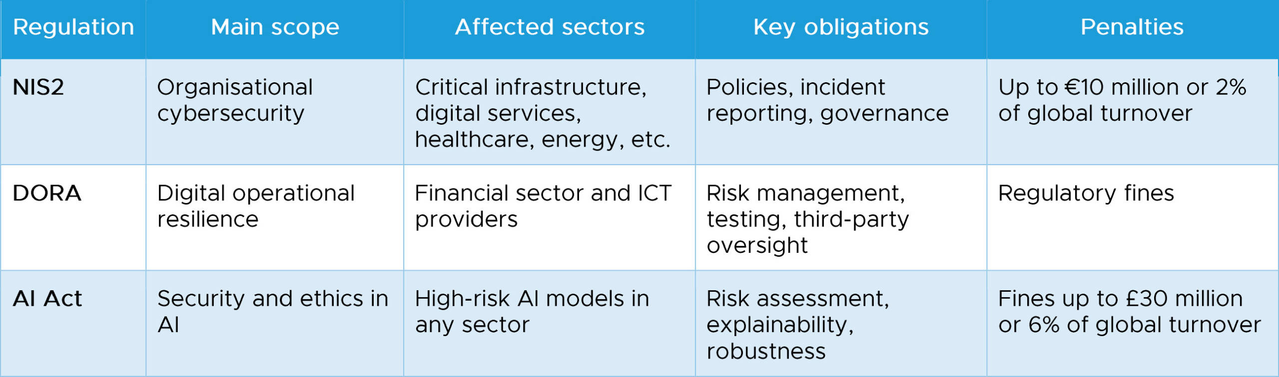 - If an AI model is used in a environment regulated by DORA or NIS2, it must comply with the requirements of both frameworks.