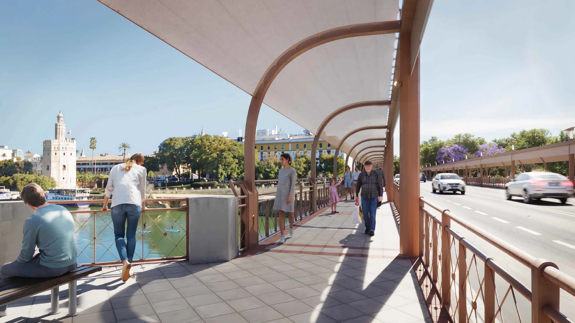 The project builds on the pioneering design of José Luis Manzanares Japón, founder of Ayesa, who first conceived the use of sidewalk canopies on the Cristo de la Expiración Bridge.