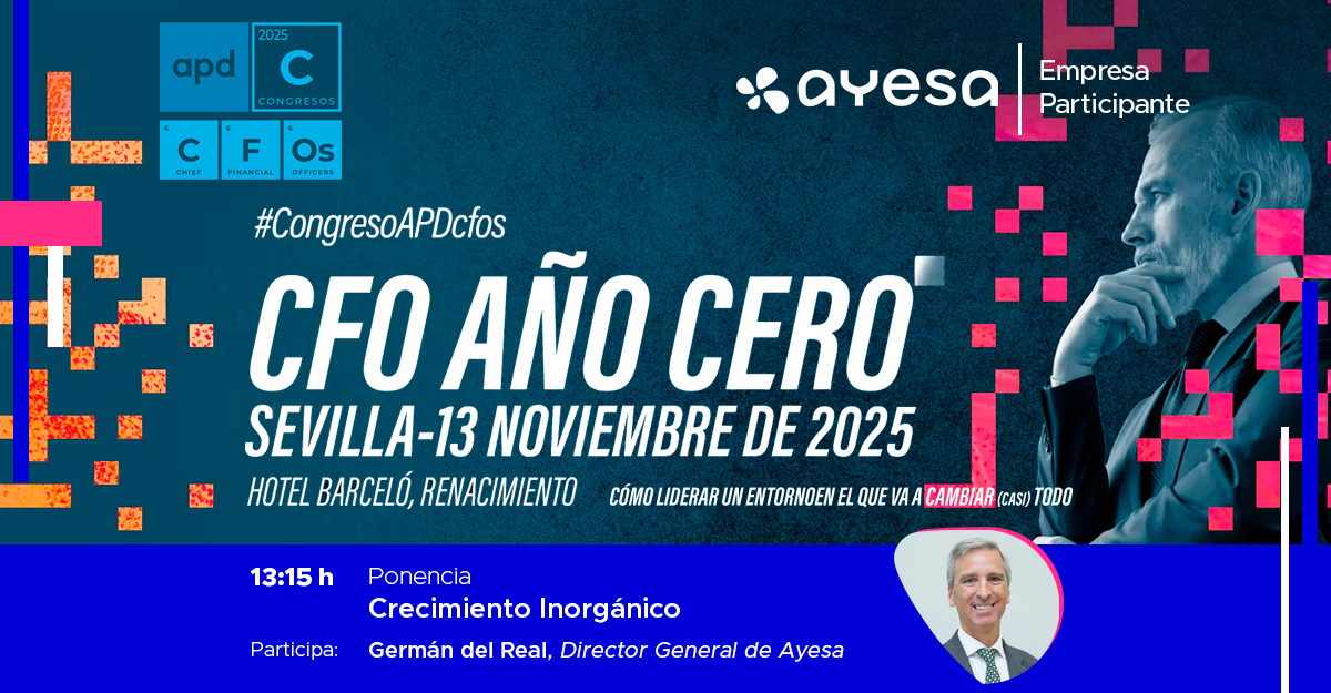 Ayesa participará en la jornada y será nuestro Director General, Germán del Real, el encargado de representarnos con la ponencia «Crecimiento Inorgánico». En un escenario donde los recursos son escasos y la presión por crecer no da tregua, el crecimiento inorgánico aparece como vía de aceleración. Pero no todo vale. Reflexionaremos sobre cómo valorar cuándo una adquisición o una alianza tiene verdadero sentido estratégico, qué riesgos deben anticipar los CFOs y qué condiciones hacen que la integración de nuevas capacidades genere valor real. Tendrá lugar a las 13:15 h.