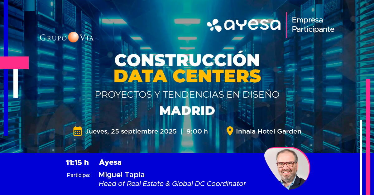 Ayesa participa en la jornada y será nuestro Head of Real Estate & Global DC Coordinator, Miguel Tapia, el encargado de representarnos tanto en la exposición de nuestra oferta, como en el posterior debate. Tendrá lugar a las 11:15 h.