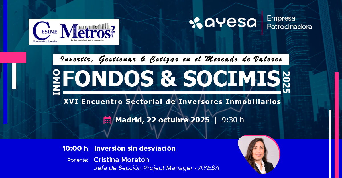 El próximo miércoles 22 de octubre, organizado por CESINE Jornadas y Metros2 Cesine, tendrá lugar «INMOFONDOS & SOCIMIS 2025 – XVI Encuentro Sectorial de Inversores Inmobiliarios», evento de referencia que contará con la participación de grandes expertos, grandes marcas y grandes inversores que hablarán de: