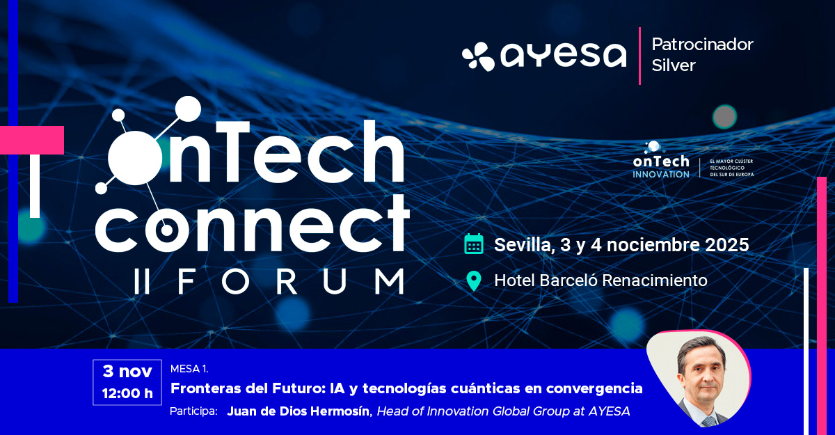 Ayesa, como Patrocinador Silver de la jornada, participará de la mano de nuestro Head of Innovation Global Group, Juan de Dios Hermosín, en la «Mesa 1. Fronteras del Futuro: Inteligencia Artificial y Tecnologías Cuánticas en Convergencia». Será en la jornada del 3 de noviembre a las 12:00 h.