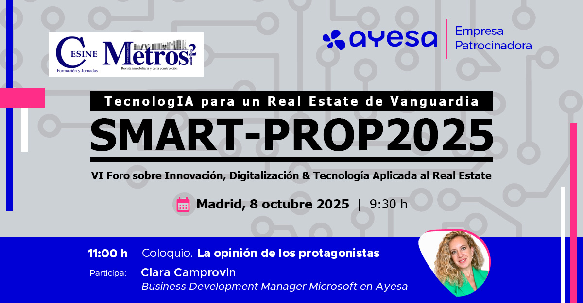 El próximo miércoles 8 de octubre, organizado por CESINE Jornadas y Metros2 Cesine, tendrá lugar «SMART-PROP 2025 – VI Foro sobre Innovación, Digitalización & Tecnología Aplicada al Real Estate», evento de referencia que reunirá en Madrid a los grandes protagonistas del ecosistema PropTech, FinTech y ConstruTech para analizar el COMPROMISO del sector inmobiliario con la innovación, la digitalización y la tecnología.